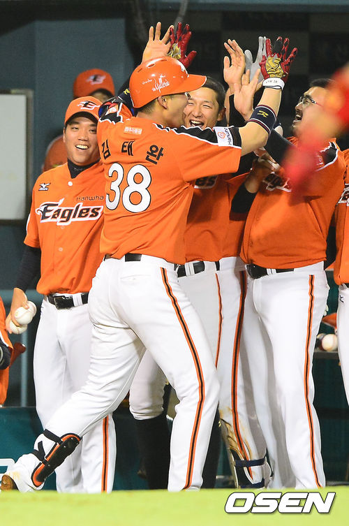 28일 오후 서울 잠실구장에서 열린 2013 한국야쿠르트 세븐프로야구 LG 트윈스와 한화 이글스 경기, 8회초 1사 주자 없는 상황에서 한화 김태완이 좌월 솔로홈런을 날린 후 덕아웃에서 동료들과 기쁨을 나누고 있다.