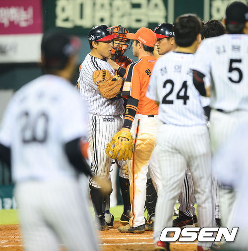 6회말 LG 윤요섭의 타석때 바티스타의 사인에 윤요섭이 발끈하며 한화와 LG 선수들이 그라운드로 뛰어들고 있다./ rumi@osen.co.kr