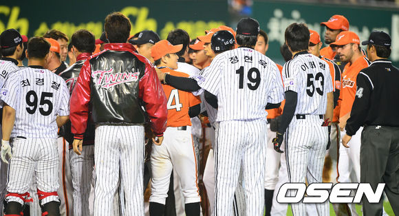 6회말 LG 윤요섭의 타석때 바티스타의 사인에 윤요섭이 발끈하며 한화와 LG 선수들이 그라운드로 뛰어들고 있다./ rumi@osen.co.kr