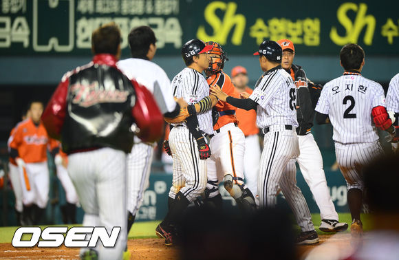 6회말 LG 윤요섭의 타석때 바티스타의 사인에 윤요섭이 발끈하며 한화와 LG 선수들이 그라운드로 뛰어들고 있다./ rumi@osen.co.kr