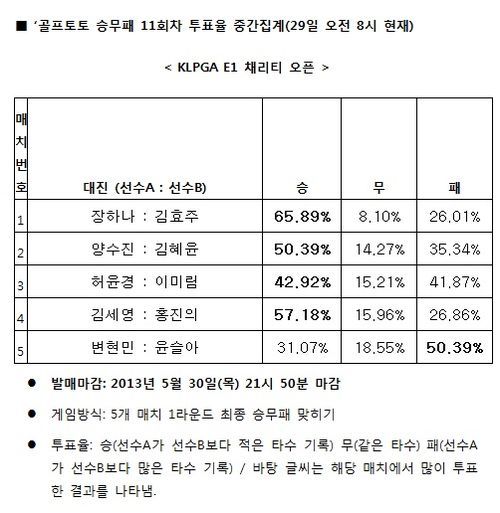 국민체육진흥공단(www.kspo.or.kr)이 발행하는 체육진흥투표권 수탁사업자인 스포츠토토 공식 온라인 발매 사이트인 베트맨(www.betman.co.kr)은 31일에 경기도 이천의 휘닉스스프링스에서 열리는 'KLPGA E1 채리티 오픈' 1라운드를 대상으로 한 승무패 11회차 게임을 중간 집계한 결과, 1번 매치에서 2주 연속 우승을 노리고 있는 상금랭킹 1위 장하나가 무서운 신인 김효주를 누를 것으로 예상한 참가자가 65.89%로 나타났다고 밝혔다.