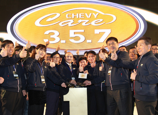 쉐비 케어 3.5.7 어슈어런스는 3년간 차대차 파손사고 시 신차교환, 5년 또는 10만km 차체 및 일반부품 보증기간 적용, 7년간 24시간 무상 긴급출동 서비스로 구성된다(단, 라보, 다마스 경상용차와 수입모델인 카마로·콜벳, LPG 차량 중 면세차량 (장애인 LPG 면세차량, 렌터카 등), 택시, 조달가·리스차량, 법인명의 구입차량은 제외).