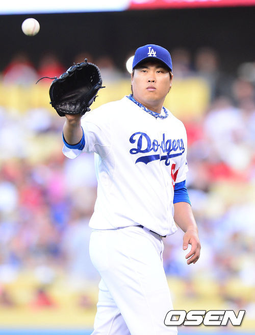 29일 오전(이하 한국시간) 미국 캘리포니아주 로스앤젤레스 다저스타디움에서 열린 LA 다저스와 LA 에인절스의 경기 , LA 류현진이 공을 건네받고 있다.