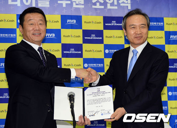 29일 오전 서울 중구 프레스센터에서 진행된 '러시앤캐시 2013 월드리그 국제남자배구대회 타이틀후원 조인식'에서 대한배구협회 임태희 회장과 아프로파이낸션 최윤 회장이 조인서를 들고 포토타임을 갖고 있다.