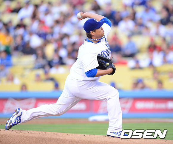 29일 오전(이하 한국시간) 미국 캘리포니아주 로스앤젤레스 다저스타디움에서 열린 LA 다저스와 LA 에인절스의 경기 , LA 류현진이 역투하고 있다