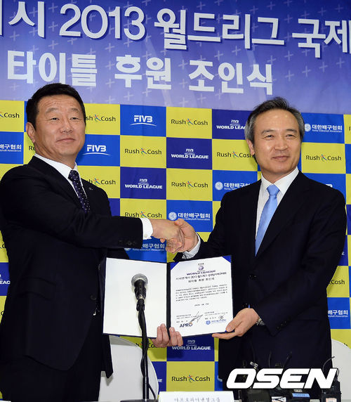 29일 오전 서울 중구 프레스센터에서 진행된 '러시앤캐시 2013 월드리그 국제남자배구대회 타이틀후원 조인식'에서 대한배구협회 임태희 회장과 아프로파이낸션 최윤 회장이 조인서를 들고 포토타임을 갖고 있다.