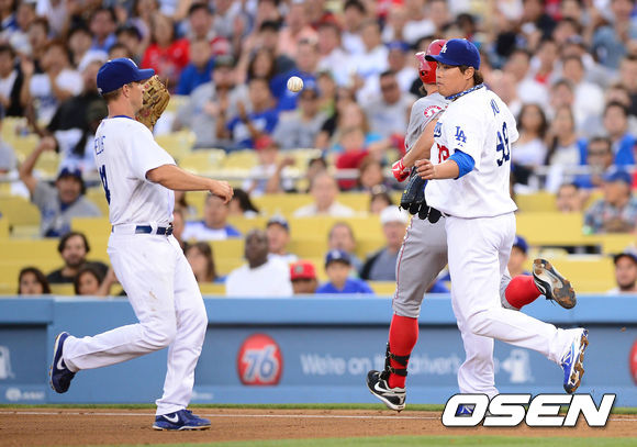 29일 오전(이하 한국시간) 미국 캘리포니아주 로스앤젤레스 다저스타디움에서 열린 LA 다저스와 LA 에인절스의 경기,3회초 1사 에인절스 블랜튼의 내야 땅볼때 다저스 류현진이 커버플레이를 펼치며 타자를 아웃시키고 있다.