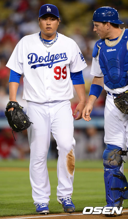 29일 오전(이하 한국시간) 미국 캘리포니아주 로스앤젤레스 다저스타디움에서 열린 LA 다저스와 LA 에인절스의 경기,4회초 다저스 류현진이 에인절스 타선을 삼자범퇴로 막은 후 엘리스 포수와 이야기를 나누며 더그아웃으로 들어가고 있다.