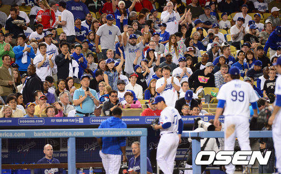 29일 오전(이하 한국시간) 미국 캘리포니아주 로스앤젤레스 다저스타디움에서 열린 LA 다저스와 LA 에인절스의 경기,5회초 에인절스 타선을 삼자범퇴로 막은 다저스 류현진이 홈팬들의 기립박수를 받으며 더그아웃으로 들어가고 있다