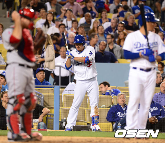 29일 오전(이하 한국시간) 미국 캘리포니아주 로스앤젤레스 다저스타디움에서 열린 LA 다저스와 LA 에인절스의 경기,5회초 무사 1루 다저스 크루즈의 타석때 류현진이 대기타석에서 스윙 연습을 하고 있다