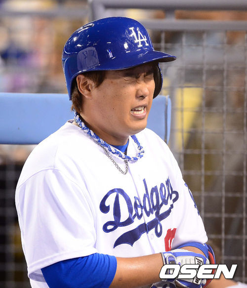 29일 오전(이하 한국시간) 미국 캘리포니아주 로스앤젤레스 다저스타디움에서 열린 LA 다저스와 LA 에인절스의 경기,7회말 1사 다저스 류현진이 내야땅볼을 친 후 아쉬워하고 있다. 류현진은 3회초 2루타를 날린뒤 슬라이딩 펼치며 2루에 세이프됐다. 두번째 타석은 삼진아웃.
