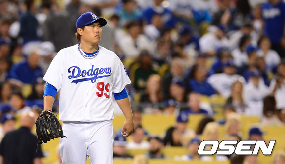 29일 오전(이하 한국시간) 미국 캘리포니아주 로스앤젤레스 다저스타디움에서 열린 LA 다저스와 LA 에인절스의 경기,8회초 다저스 류현진이 그라운드로 들어서고 있다.