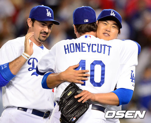 29일 오전(이하 한국시간) 미국 캘리포니아주 로스앤젤레스 다저스타디움에서 열린 LA 다저스와 LA 에인절스의 경기 종료 후 류현진이 동료들과 포옹을 나누고 있다.
