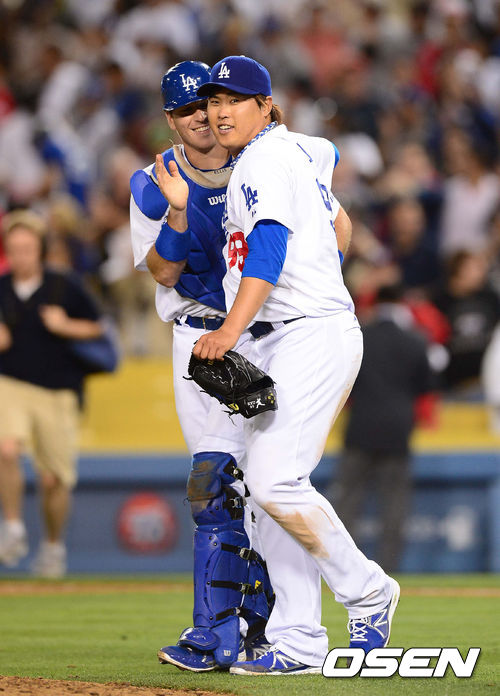 경기종료 후 다저스 류현진이 엘리스 포수와 기쁨을 나누고 있다. / baik@osen.co.kr
