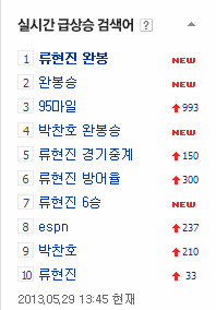 그러자 국내 포털 사이트가 난리가 났다. 경기 직후 한 포털사이트는 1위부터 10위까지 모두 류현진 혹은 류현진과 관련된 검색어로 도배됐다. 류현진이 거둔 '완봉승'에 대한 궁금증부터 이날 경기를 미국 전역에 생중계한 스포츠 전문채널 ESPN에까지 관심이 모아졌다.