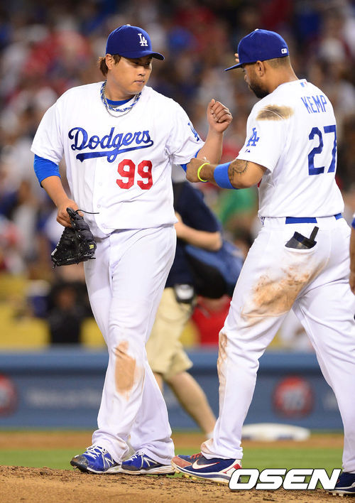 경기종료 후 완봉승 거둔 다저스 류현진이 맷 켐프와 승리의 기쁨을 나누고 있다. / baik@osen.co.kr