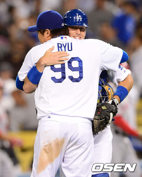 경기종료 후 다저스 류현진이 엘리스 포수와 기쁨을 나누고 있다. / baik@osen.co.kr