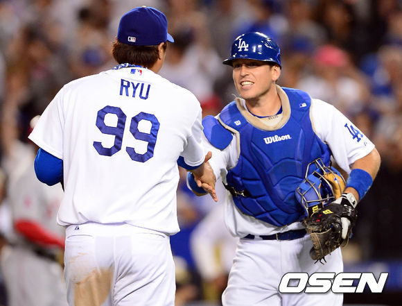 29일 오전(이하 한국시간) 미국 캘리포니아주 로스앤젤레스 다저스타디움에서 열린 LA 다저스와 LA 에인절스의 경기 종료 후 류현진이 AJ 엘리스의 축하를 받고 있다.