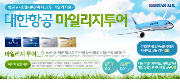 마일리지 투어는 대한항공 이용객들이 적립해 둔 스카이패스 마일리지를 이용해 한진관광의 패키지 여행상품을 이용하는 프로그램이다. 스카이패스 마일리지를 사용해 왕복항공권과 호텔 숙박, 현지 여행경비가 포함된 보너스 여행을 다녀올 수 있어 그동안 쌓아만 두었던 포인트를 알뜰하게 사용할 수 있다.
