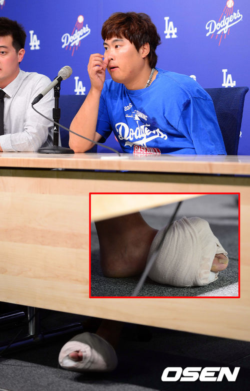 경기종료 후 완봉승 거둔 다저스 류현진이 왼쪽 발에 붕대를 감은채 기자회견을 하고 있다. 류현진은 4회초 2사 에인절스 마이크 트럼보의 타구를 발등으로 막으며 내야땅볼 처리시켰다. / baik@osen.co.kr
