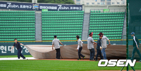 29일 오후 서울 잠실야구장에서 열리는 '2013 한국야쿠르트 세븐 프로야구' LG 트윈스와 한화 이글스의 경기를 앞두고 구장 관리자들이 그라운드를 방수포로 덮고 있다.