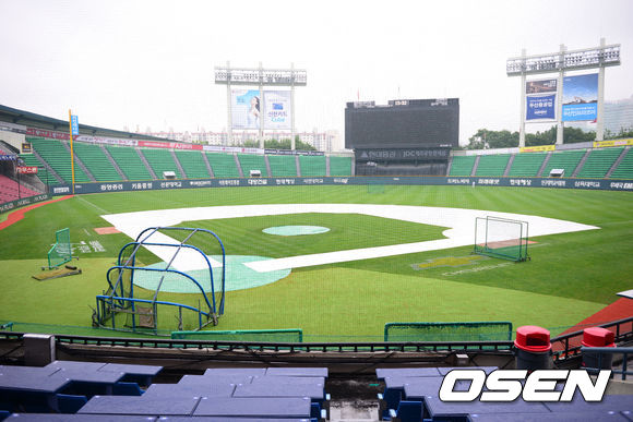 29일 오후 서울 잠실야구장에서 열리는 '2013 한국야쿠르트 세븐 프로야구' LG 트윈스와 한화 이글스의 경기를 앞두고 그라운드가 방수포로 덮여있다.