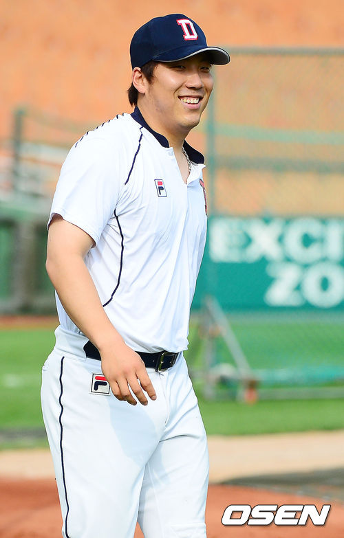 29일 오후 부산 사직구장에서 2013 한국야쿠르트 세븐프로야구 롯데 자이언츠와 두산 베어스의 경기가 열릴 예정인 가운데 훈련시간에 두산 김현수가 수비훈련을 나가며 미소짓고 있다.
