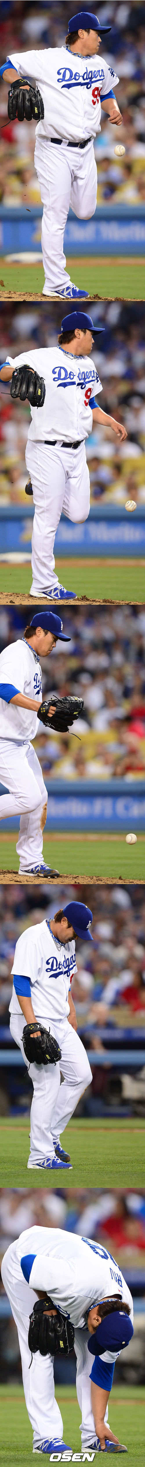 류현진이 4회초 2사 에인절스 마이크 트럼보의 타구를 발등으로 막아내고 있다. 이후 류현진은 떨어진 타구를 침착하게 잡은 뒤 내야땅볼 아웃 시켰다./ baik@osen.co.kr