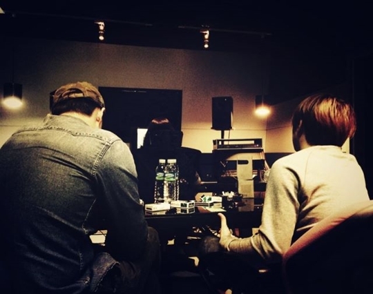 사진 속에는 린이 언급한대로 듬직한 뒷모습을 선보이고 있는 이수와 그 옆에서 다소 왜소해(?) 보이는 바이브 류재현의 모습이 담겨있다. 음악 작업에 열중하고 있는 듯한 두 사람의 모습이 눈길을 끈다.