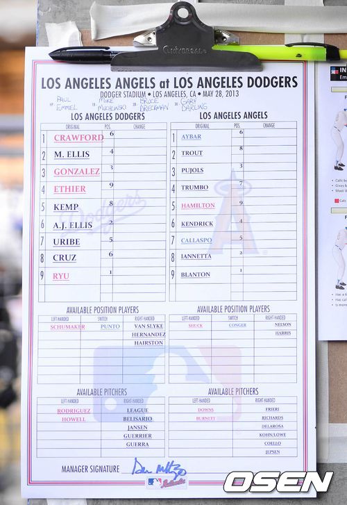 경기 전 양팀의 선발 라인오더가 더그아웃에 붙어 있다. / baik@osen.co.kr