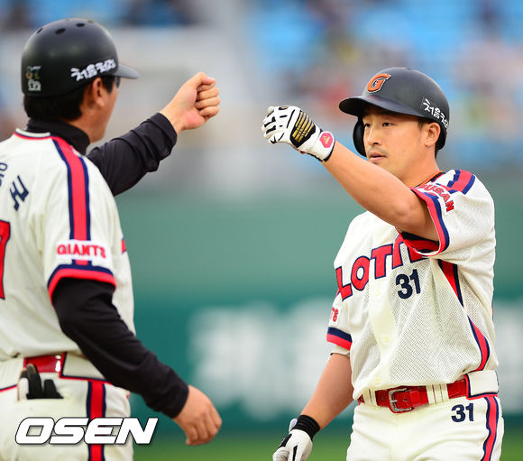 29일 오후 부산 사직구장에서 열린 2013 한국야쿠르트 세븐프로야구 롯데 자이언츠와 두산 베어스의 경기, 1회말 1사 주자 2루 롯데 손아섭이 중견수 앞 선취 1타점 적시타를 날린 후 1루에서 김응국 코치와 하이파이브를 하고 있다.