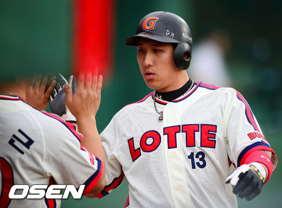 29일 오후 부산 사직구장에서 열린 2013 한국야쿠르트 세븐프로야구 롯데 자이언츠와 두산 베어스의 경기, 1회말 1사 주자 2루 롯데 손아섭의 중견수 앞 선취 1타점 적시타때 홈을 밟은 황재균이 덕아웃에서 동료들과 기쁨을 나누고 있다.