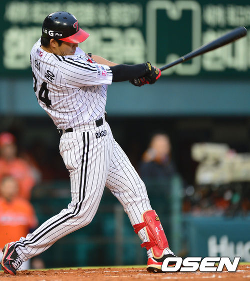 29일 오후 서울 잠실야구장에서 '2013 한국야쿠르트 세븐 프로야구' LG 트윈스와 한화 이글스의 경기가 열렸다. 1회말 2사 3루 상황 4번 정의윤이 1타점 선제 좌전 적시타를 날리고 있다.
