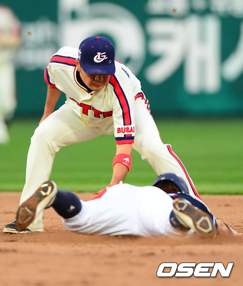 29일 오후 부산 사직구장에서 열린 2013 한국야쿠르트 세븐프로야구 롯데 자이언츠와 두산 베어스의 경기, 3회초 2사 주자 1루 두산 이종욱 타석에서 1루 주자 정수빈이 도루를 시도했으나 롯데 유격수 문규현에게 태그아웃 당하고 있다.