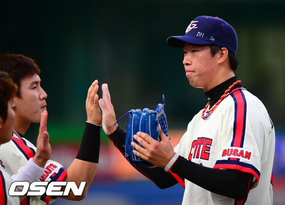 29일 오후 부산 사직구장에서 열린 2013 한국야쿠르트 세븐프로야구 롯데 자이언츠와 두산 베어스의 경기, 3회를 마친 롯데 선발 이재곤이 동료들과 하이파이브를 하고 있다.