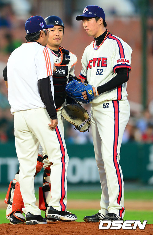 29일 오후 부산 사직구장에서 열린 2013 한국야쿠르트 세븐프로야구 롯데 자이언츠와 두산 베어스의 경기, 4회초 1사 주자 1,2루 두산 홍성흔 타석에서 롯데 정민태 투수코치가 마운드에 올라 롯데 선발 이재곤과 얘기를 나누고 있다.