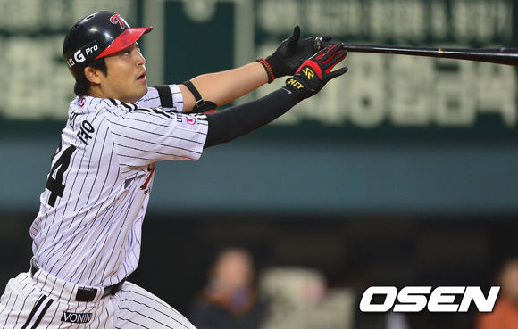 29일 오후 서울 잠실야구장에서 '2013 한국야쿠르트 세븐 프로야구' LG 트윈스와 한화 이글스의 경기가 열렸다. 3회말 LG 공격 1사 1루 상황 4번 정의윤이 우익수 키를 넘는 1타점 3루타를 날리고 타구를 바라보고 있다.