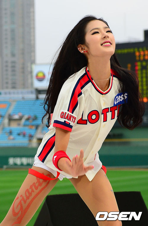 29일 오후 부산 사직구장에서 열린 2013 한국야쿠르트 세븐프로야구 롯데 자이언츠와 두산 베어스의 경기, 롯데 치어리더 박기량이 무대 위에서 화려한 공연을 펼치고 있다.
