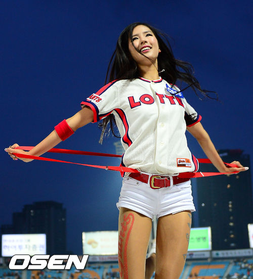 29일 오후 부산 사직구장에서 열린 2013 한국야쿠르트 세븐프로야구 롯데 자이언츠와 두산 베어스의 경기, 롯데 치어리더 박기량이 무대 위에서 화려한 공연을 펼치고 있다.