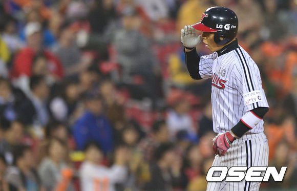 29일 오후 서울 잠실야구장에서 '2013 한국야쿠르트 세븐 프로야구' LG 트윈스와 한화 이글스의 경기가 열렸다. 4회말 LG 공격 선두타자로 나선 7번 권용관이 좌월 솔로포를 날리고 그라운드를 돌며 경례 세리머니를 선보이고 있다.