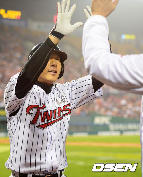 29일 오후 서울 잠실야구장에서 '2013 한국야쿠르트 세븐 프로야구' LG 트윈스와 한화 이글스의 경기가 열렸다. 4회말 LG 공격 선두타자로 나선 7번 권용관이 좌월 솔로포를 날리고 더그아웃 동료들과 인사를 나누고 있다.