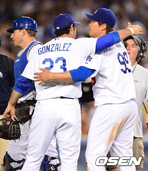 류현진이 곤살레스로 부터 완봉구와 함께 축하를 받고 있다. / baik@osen.co.kr