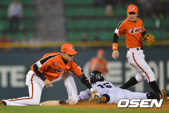 29일 오후 서울 잠실야구장에서 '2013 한국야쿠르트 세븐 프로야구' LG 트윈스와 한화 이글스의 경기가 열렸다. 6회말 LG 공격 1사 1루 상황 주자 정주현이 2루 도루에 성공하고 있다.