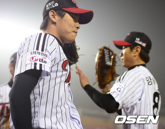 29일 오후 서울 잠실야구장에서 '2013 한국야쿠르트 세븐 프로야구' LG 트윈스와 한화 이글스의 경기가 열렸다. 7회초 한화 공격 2사 주자없는 상황 7번 이여상을 우익수 플라이로 처리한 LG 투수 임정우가 우익수 양영동과 인사를 나누고 있다.
