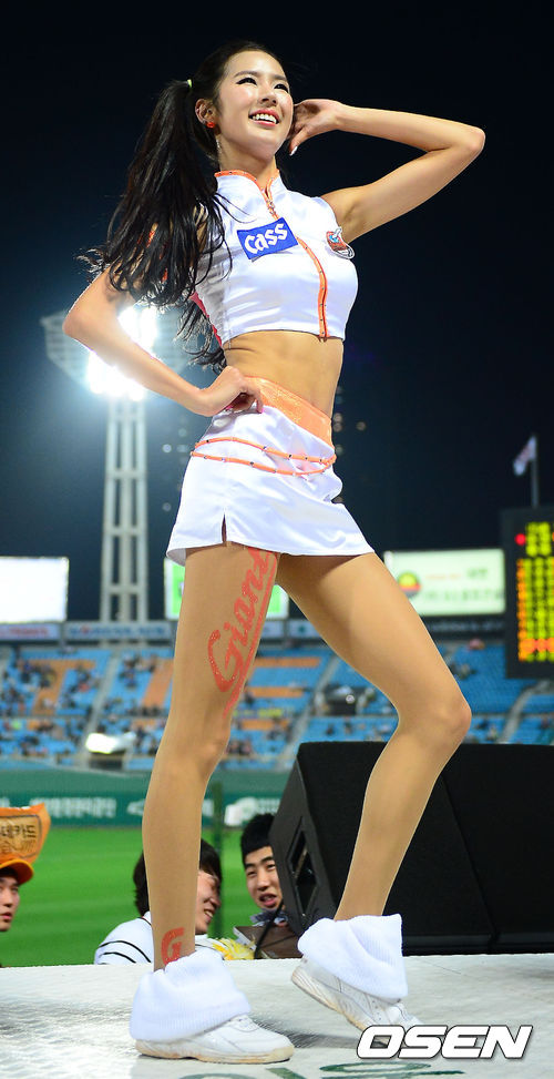 29일 오후 부산 사직구장에서 열린 2013 한국야쿠르트 세븐프로야구 롯데 자이언츠와 두산 베어스의 경기, 롯데 치어리더 박기량이 무대 위에서 화려한 공연을 펼치고 있다.
