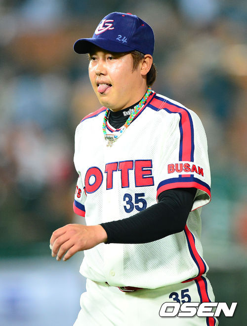 29일 오후 부산 사직구장에서 열린 2013 한국야쿠르트 세븐프로야구 롯데 자이언츠와 두산 베어스의 경기, 8회초를 막아낸 롯데 이명우가 혀를 내밀며 덕아웃으로 향하고 있다.