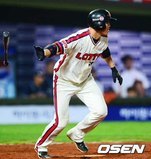 29일 오후 부산 사직구장에서 열린 2013 한국야쿠르트 세븐프로야구 롯데 자이언츠와 두산 베어스의 경기, 8회말 무사 주자 2,3루 롯데 박종윤이 좌중간 2타점 적시타를 날리고 있다.