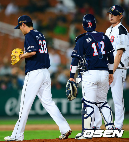 29일 오후 부산 사직구장에서 열린 2013 한국야쿠르트 세븐프로야구 롯데 자이언츠와 두산 베어스의 경기, 8회말 무사 주자 1루 롯데 강민호가 우중간 2루타를 날렸을때 두산 선발 노경은이 교체되고 있다.
