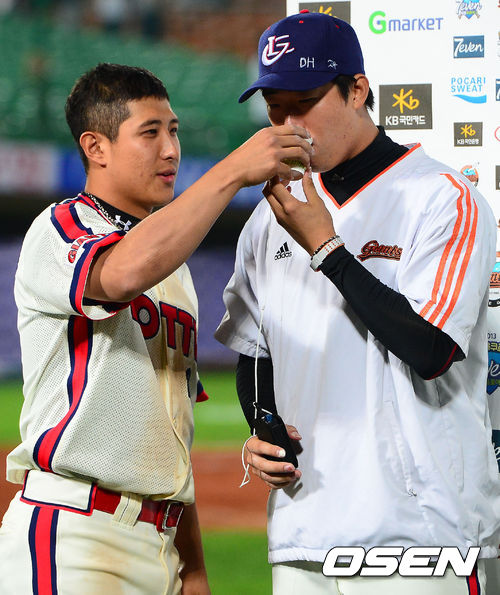 경기를 마치고 롯데 승리투수 이재곤이 인터뷰를 할때 황재균이 음료를 갖다주는 세레머니를 하고 있다. / rumi@osen.co.kr