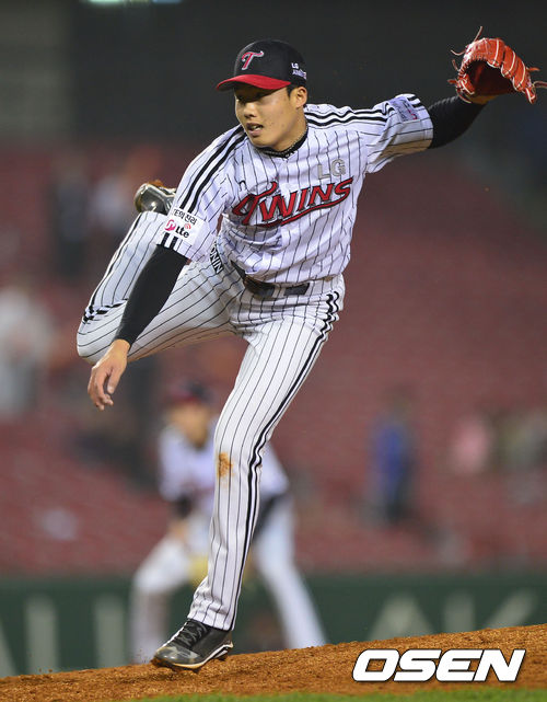 29일 오후 서울 잠실야구장에서 '2013 한국야쿠르트 세븐 프로야구' LG 트윈스와 한화 이글스의 경기가 열렸다. 9회초 한화 공격, 최근 물벼락 세리머니로 논란이 된 LG 투수 임찬규가 마운드에 올라 힘차게 공을 던지고 있다.
